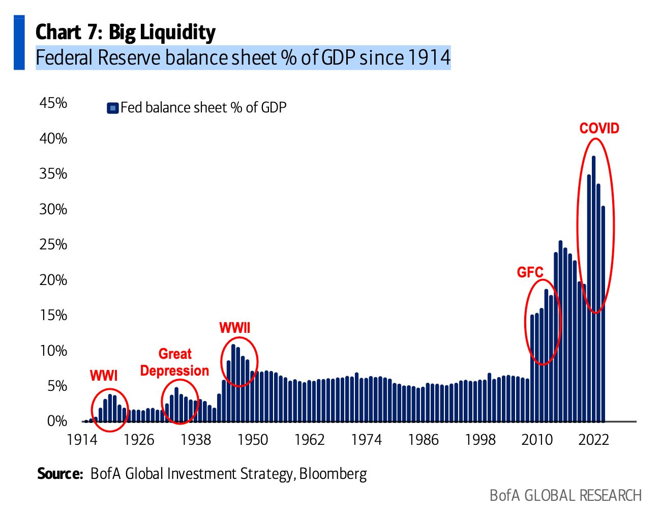 31%: Fed balance sheet as % of GDP…was 0% to 3% during WWI, 2% to 11% during WWII, 6% to 15% after GFC, hit high of 37% after COVID