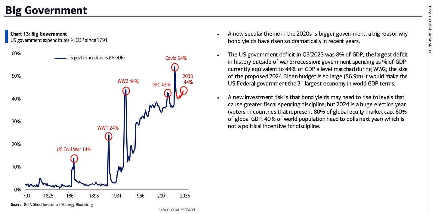 44%: US government spending % GDP…peaked at 24% in WWI, 44% in WWII, 43% after GFC, hit high of 54% after COVID